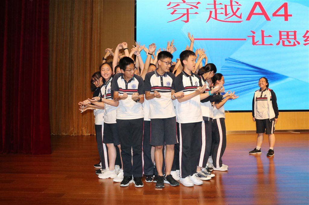 在穿越A4纸项目中,每个班级想法不一,有的抱在身上,有的把纸剪得很细很长;在这个项目中增加了大家的沟通意识和解决问题能力,冲破了思维定势。