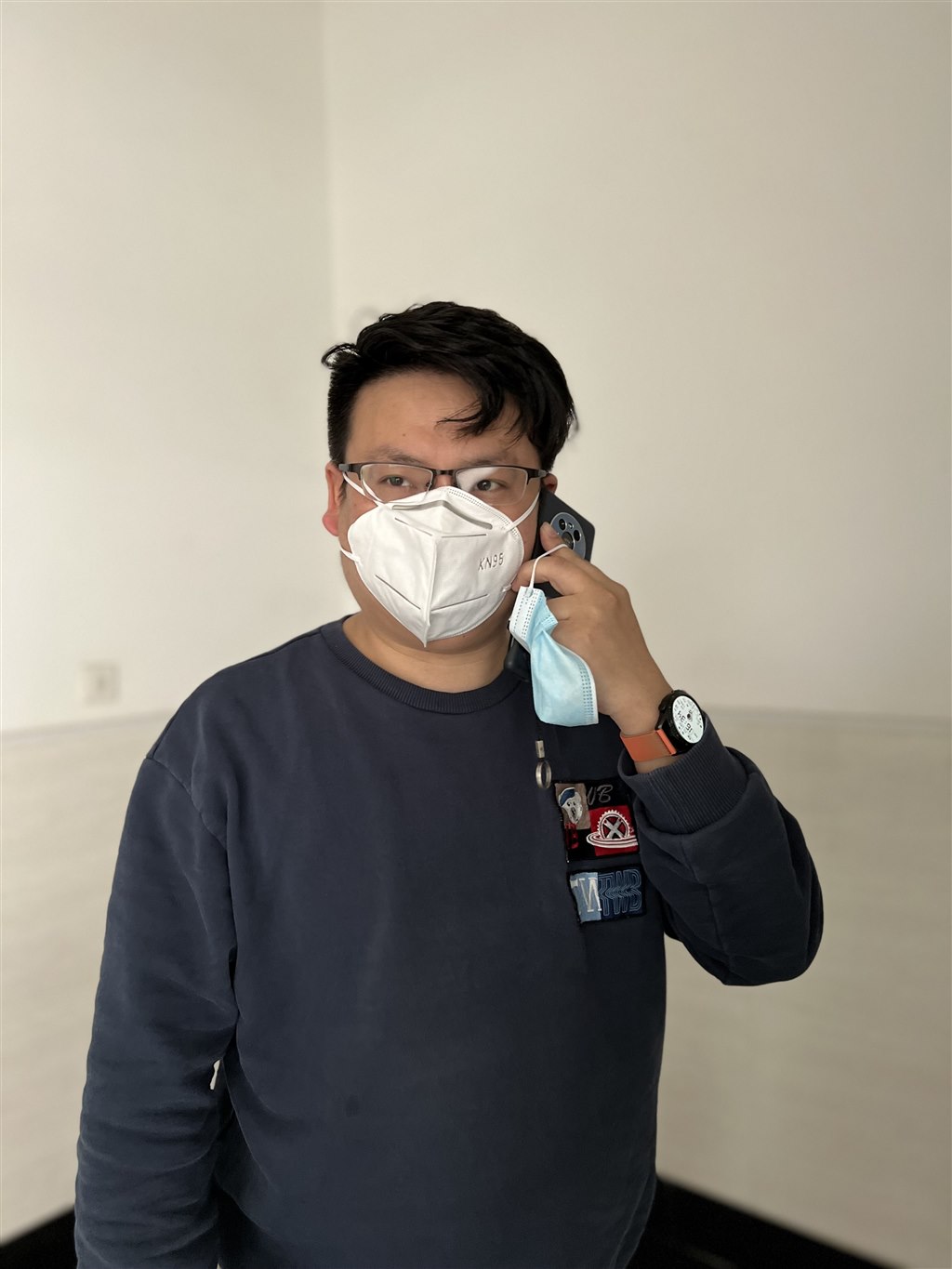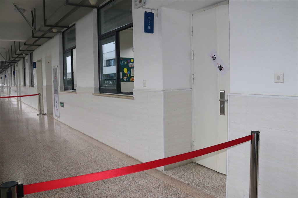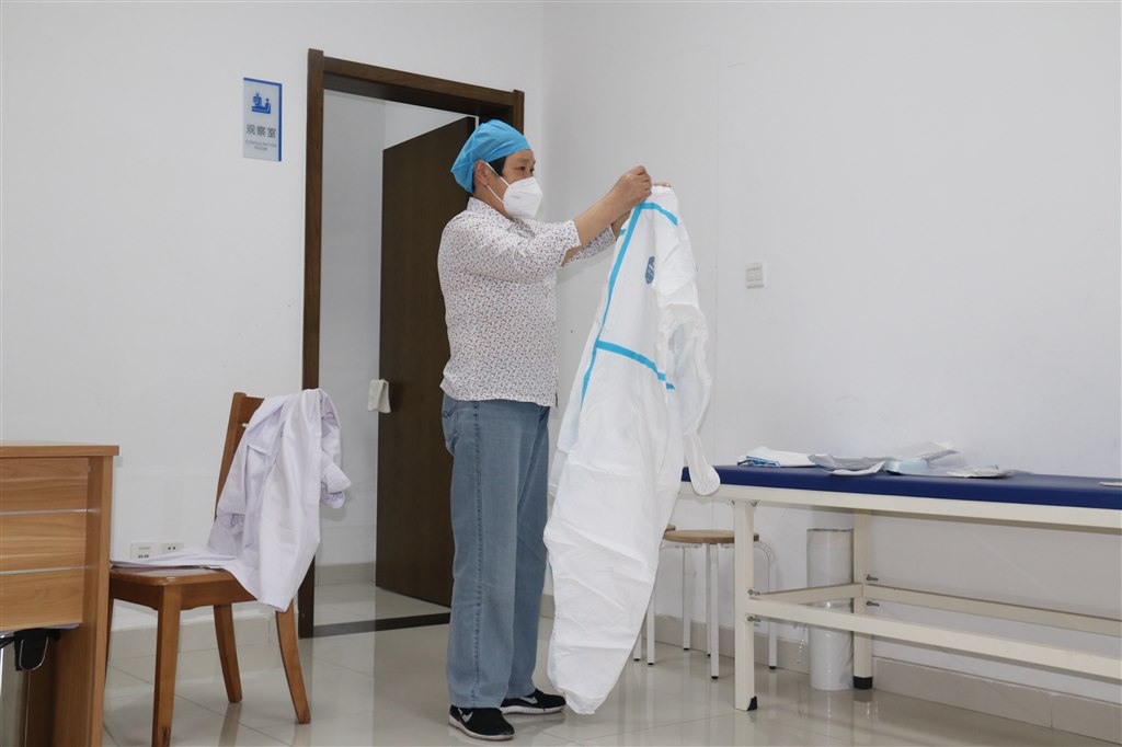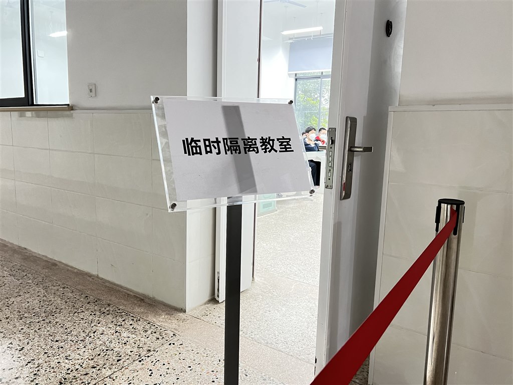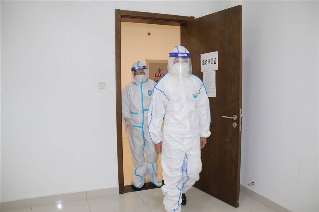 校医杨婉萍身着全套防护装备前往“阳性”学生所在教学区域,按疫情防控要求,将“阳性”学生带到应急隔离室进行隔离。