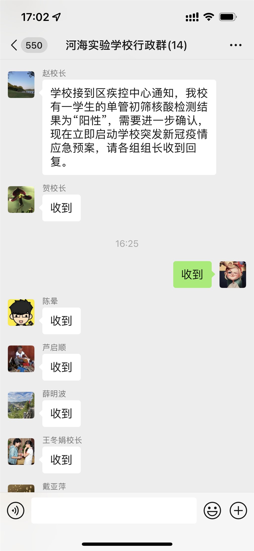 下午16:25,学校接区疾控部门通知,有一学生的单管初筛核酸检测结果为阳性。总指挥赵卫勇校长立即通知学校疫情防控专班启动应急机制,同时向新北区疾控中心、新北区疫情防控指挥部、属地指挥部负责人、上级教育主管部门负责人等“五大员”报告。各工作组人员闻令而动,按照预案各司其职,迅速进入实战状态。