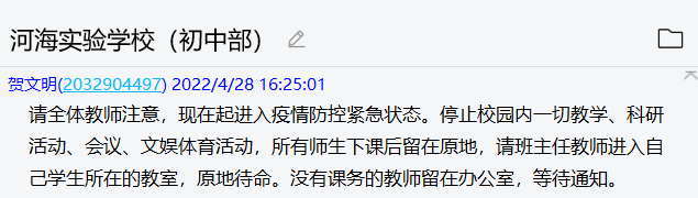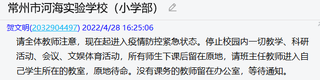 管控督查组组长贺文明副校长接到通知后,立即通过工作群发布进入疫情防控紧急状态的通知,同时办公室朱虹主任广播通知所有人员原地待命,不流动,校园实行封闭管理,不进不出。