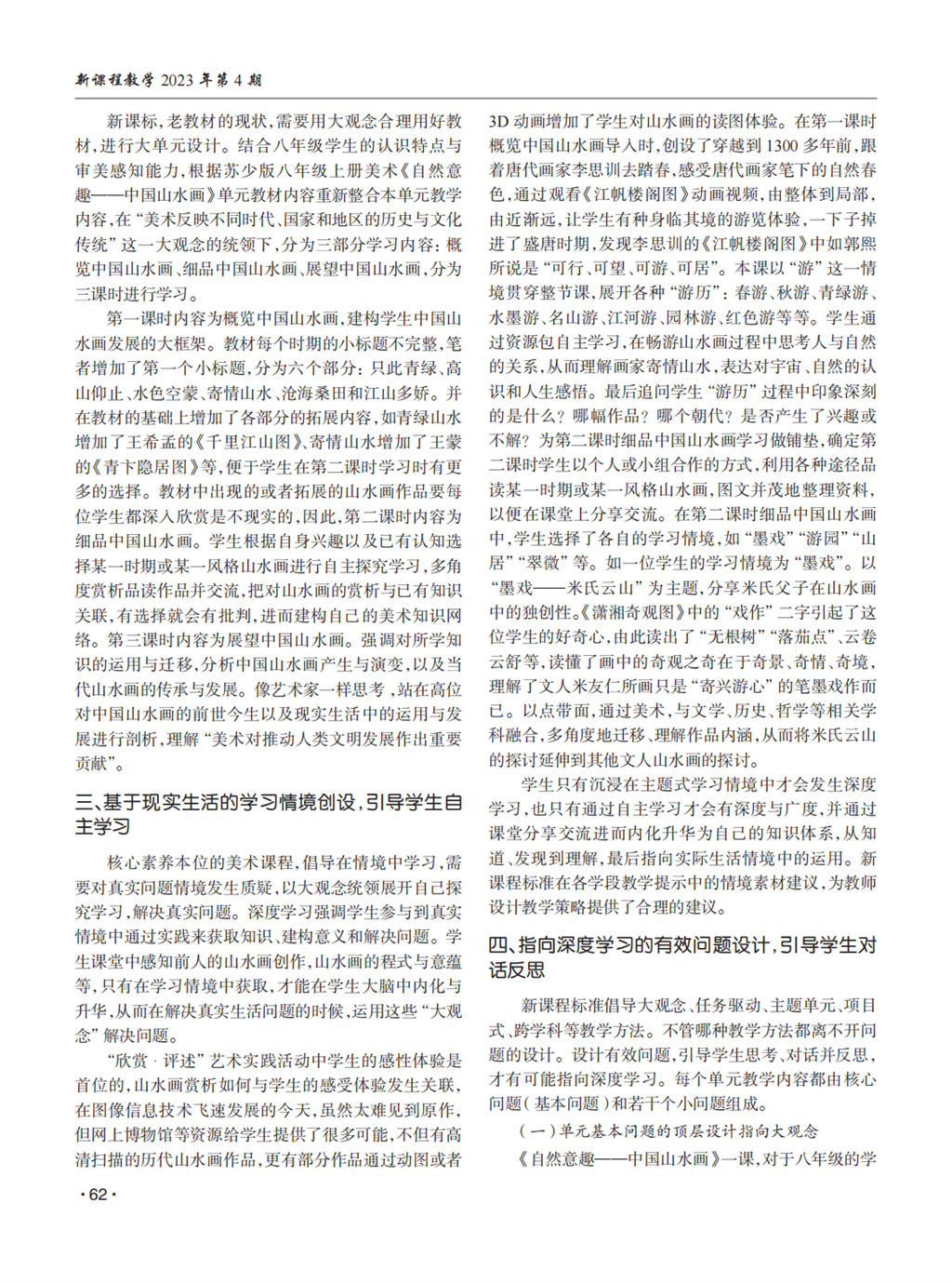 马郁茜《初中美术学科指向深度学习的“容·智“课堂实践研究》发表在《新课程教学》202302