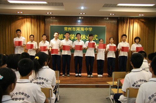 首先宣布的是奖学金获得者名单,有11名同学获得一等奖学金,每位将获得1000元奖学金,有23名同学获得二等奖学金,每位将获得800元奖学金,有26名同学获得三等奖学金,每位将获得500元奖学金。奖学金获得者们迈着自豪的步伐、怀着激动的心情依次从蒋校长手中领取获奖证书和奖金,兴奋和骄傲溢于言表。紧接着宣布的是各班获得三好学生及各单项奖的名单,共有68名同学获得三好学生,324名同学获得各单项奖,各班班长代表获奖同学领取了证书。最后宣布的是在2009年《时代学习报》第四届数学文化节上获奖的13名同学,和在第六届“星星火炬”全国青少年艺术英才推选活动常州地区选拔赛中获奖的16名同学,以及常州市“三好学生”、常州市“优秀学生干部”、新北区“美德少年”。除了以上获得表彰的同学外,赵主任还专门表扬了一批为学校、为班级默默奉献、真诚服务的优秀学生,感谢他们的辛勤付出,鼓励他们快乐成长。用汗水织就实力、用拼搏铸就成功、用毅力成就梦想,学校通过表彰先进,为全体学生树立了榜样,让每一位同学都分享到成功的喜悦,真正体现了学生评价模式的多元化。