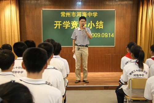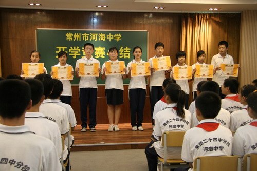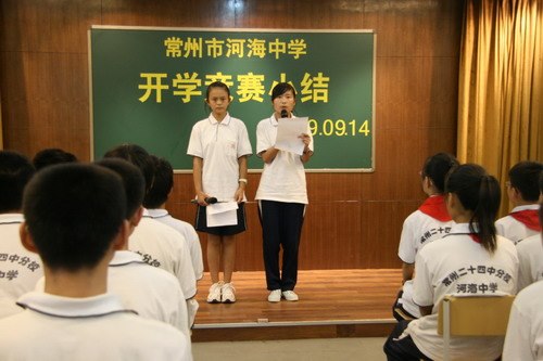 9月14日下午3点15分,河海中学举行了开学竞赛活动表彰会。会议在两位八年级主持人热情洋溢的开场白中开始。首先由三位八年级同学汇报了暑期参加的活动和切身的感受。每年开学十日竞赛,旨在通过各项评比,展示班级的风采。黑板报的一笔一划,学生们精心构思;教室里的每个角落,学生们仔细打扫;宿舍里的毛巾被子,学生们认真折叠……而对于学生的日常言行,老师们默默留意,耐心指正。正因为有了老师和学生的积极参与和认真对待,我们得以感受到书香馥郁、又各有特色的班级文化。虽然最后的结果有名次之分,但是过程中付出的艰辛是没有名次的,而培养的师生之情则是每个班级真正的财富。这次会议,既是一个小结,更是一个开始,相信河海的全体师生会用更多的收获来证明自己,展示自己,让美丽的河海校园,芬芳四溢。