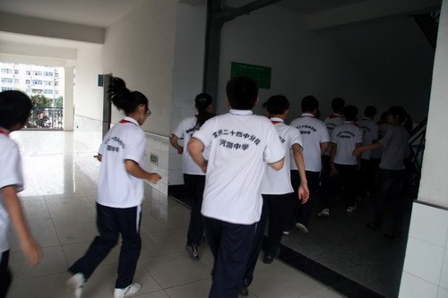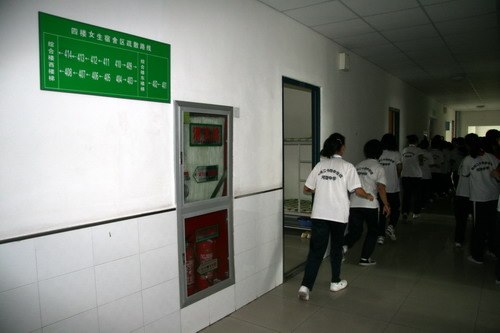 学校在教学楼和宿舍区专门设立了疏散路线示意图。演练分教学区和宿舍区两部分,随着两声长哨音,全体学生分别以班级和宿舍为单位迅速集队,按指定顺序,指定路线,快速撤离至操场。演练时间虽短,却提高了全校师生在紧急情况下的应变能力,认识了疏散演练的重要性。