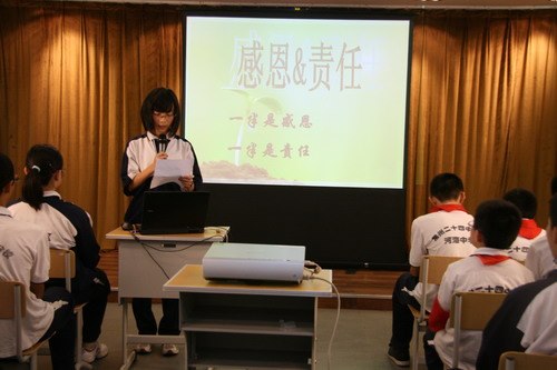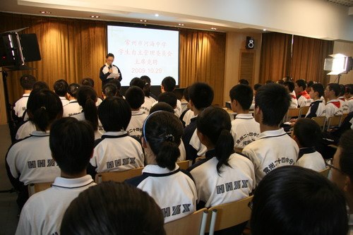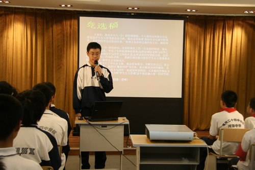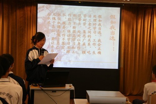 接着六位竞聘同学你方唱罢我登场,“我将以‘服务同学’为宗旨,真正做到为同学服务,为校园奉献力量,尽心尽力与同学一起建设和谐校园”;“ 不论结果如何,我都将踏实进取,服务于大家。用真诚的微笑和良好的工作态度和大家一起营造一个和谐美丽的河海中学。”;“如果我这次能当上学生会主席,我一定会竭尽全力,和所有河海的莘莘学子,一起进步,一起成长,一起收获,一起扬起梦想的风帆。”……他们经过精心的准备,在PPT演示文稿的背景下,进行了紧张、激烈而又精彩的竞聘演说,就学校管理发表了自己的见解。六位同学冷静沉着的台风、积极热情的态度、智慧而才情丰富的管理能力令全体学生赞不绝口,会场不时发出阵阵热烈的掌声。