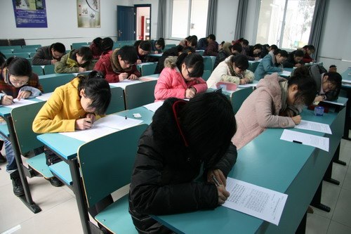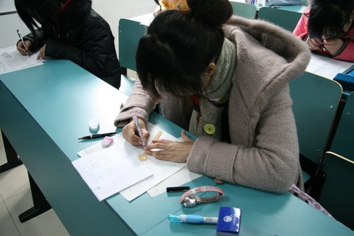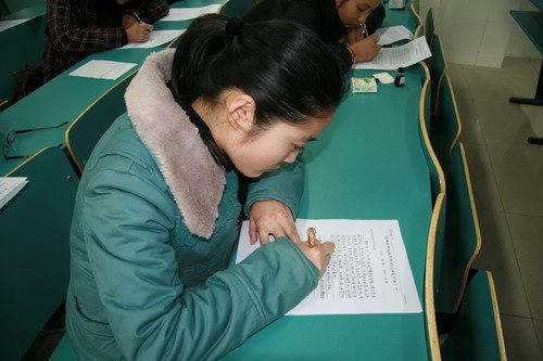 上午九点,活动在多功能教室展开。第一项为钢笔书写,它分为临摹和习作两部分,年轻教师认真临摹,用心书写。接着是第二项内容——解题能力测试。根据每个教师的科目,一部分教师考察相应学科的试卷解题能力,一部分教师则书写案例分析,大家积极思考,仔细答题。
