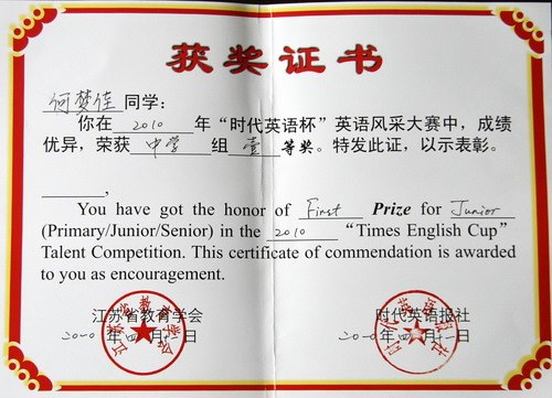 河海中学何梦佳同学于04月11日在南京举行的2010年江苏省“时代英语杯”英语风采大赛中,荣获中学组一等奖。