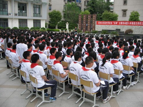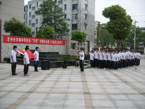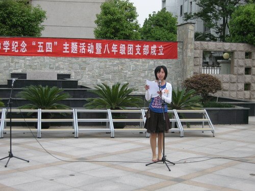 在这重要的节日里, 学校吸收150名优秀学生加入了中国共产主义青年团,为学校共青团组织输送一批新鲜的血液。在这激动人心的时刻,老团员为新团员佩戴上了团徽,新团员在八(6)班团支部书记黄慧的带领下,面向团旗庄严宣誓,铮铮的誓言表达了对团组织的无限忠诚。随后,全体团员在团旗下高唱《中国共产主义青年团团歌》,用歌声唱出自己伟大的理想。