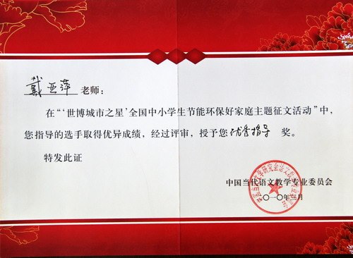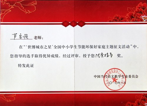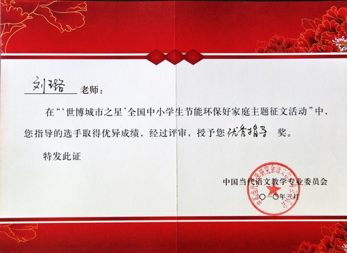 我校八名同学在“世博城市之星”节能环保好家庭主题征文大赛中取得优异成绩。他们还将获得由中国当代语文教学委员会主办的2010年“希望杯”全国优秀小作家现场作文大赛参赛资格。