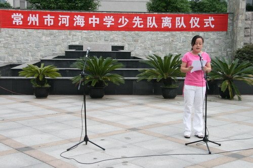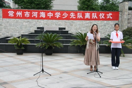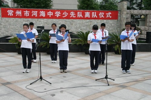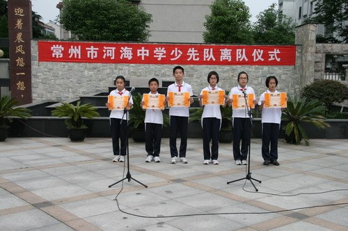 “当年轮敲响第十四次钟声的时候,我们就要告别少先队,迈进共青团,谱写生命青春的乐章”!在2010年“六一”国际儿童节这天,常州市河海中学七年级举行了隆重的少先队离队仪式暨“青春如歌”朗诵比赛。