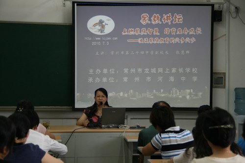首先由常州市家庭教育专家、常州市第二十四中学副校长张慧群作《点燃家庭智慧 培育生命成长》的家庭教育讲座。张校长就如何应对孩子的逆反心理,如何教育自觉性差的孩子等问题进行了深入剖析,建议家庭教育要“六多六少”,用通俗易懂的例子向家长阐述了不要溺爱孩子、做孩子的好榜样、关心孩子的成长等道理,受到家长们的一致好评。家长们聚精会神地聆听,并认真地做着笔记,精彩讲座博得了家长阵阵掌声。