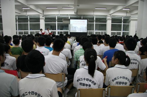 校长蒋顺国的致辞《三年情思河海路》,把整个毕业典礼推向高潮。他感谢三年的岁月把我们铸就了一个强大的群体,并且拥有一个河一般绵长、海一样宽广的名字——河海人;感受到三年的创业之路是一条曲折和艰苦跋涉的教育之路,是一条辛勤和智慧浇灌的发展之路,是一条汗水和泪水挥洒的成长之路,是一条信任和期待点燃的希望之路;感激为学校奠基、创业而付出心血的所有教师和员工、所有家长和学生;期望学子们是河海中学的一张名片,寄语并祝福全体同学:细节习惯并存,大事大器共成!
