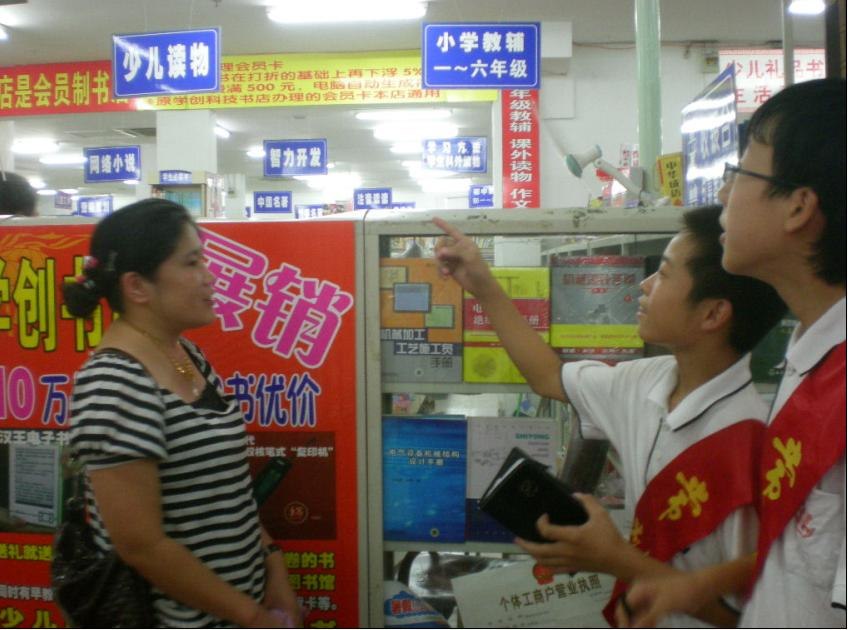 暑假期间,书城人头攒动,我们的图书导购员们忙得不亦乐乎。一名保安告诉我们:正值酷暑,气温居高不下,很多市民选择假期泡文化城,“有的干脆全家出动,一整天都在这里度过”。尤其进入八月中旬,图书城每天爆满,让小导购员们的工作量无形中提高了好几倍。每天从早上九点忙到下午四点,同学们一刻也没闲着,却没有一个去偷懒,对工作一直保持着高度的热情。两天下来,同学都显出些许疲惫,但更多的是收获——看着家长们带着孩子过来买书,仿佛看到了自己的影子,想到了父母“望子成龙,望女成凤”的殷切期望;看到书城经营户们忙碌的身影,在敬佩他们之余,更加深了对他们工作的理解;也通过自己的亲身实践,真真切切地感受到工作的辛劳,明白了“一分耕耘一分收获”,凡事都得付出努力。