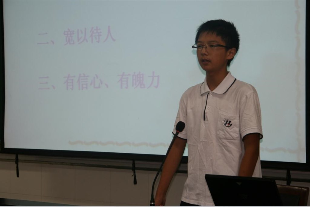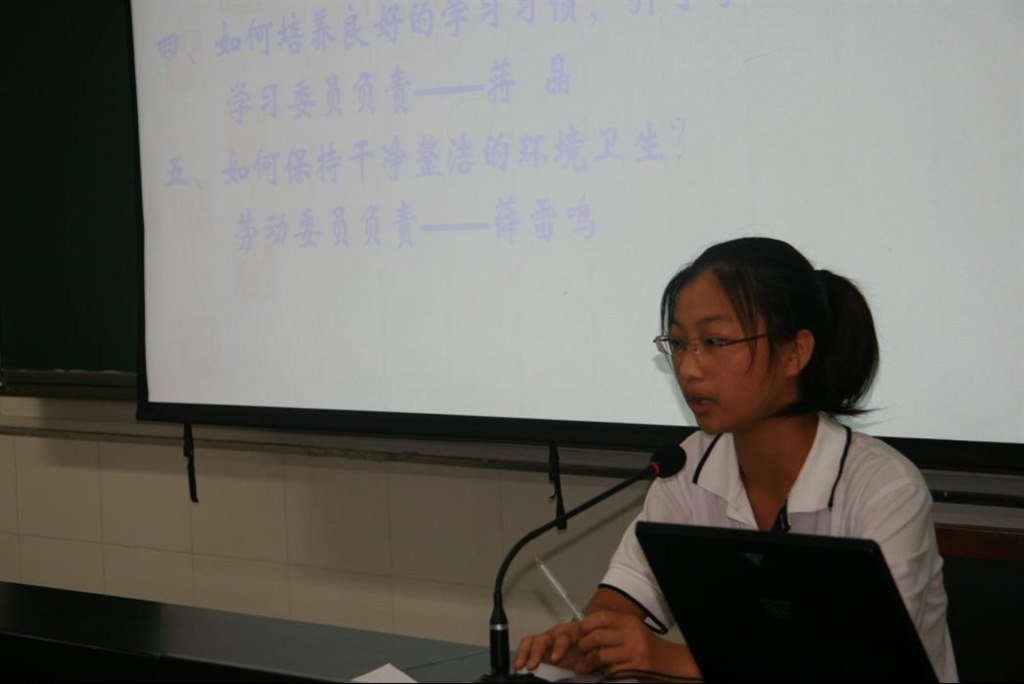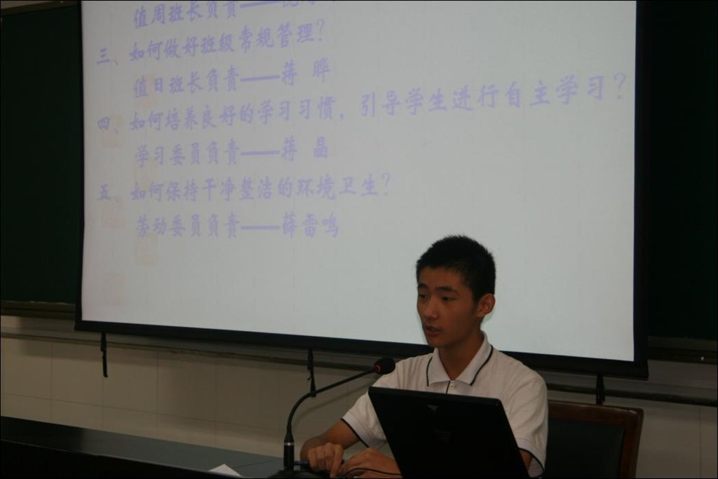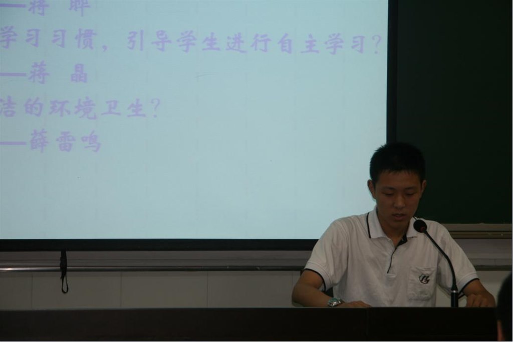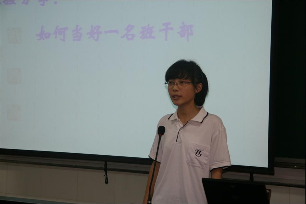 接着,全体学生干部根据各自职务分组讨论的环节使本次培训活动达到高潮。学长学姐们纷纷将班级管理经验倾囊相授,学弟学妹们积极请教,也不时发表自己的看法。讨论结束后,每一组发言人都畅谈了他们的成果。班长代表李昕总结道作为一名班长,要起好带头作用,将班级管理得井井有条,还要当好同学与老师的桥梁与纽带,让老师对班级有更多的了解。值周班长代表陈颖认为执勤时必须有良好的精神风貌,明辨是非,敢于坚持原则。值日班长代表殷商认为工作中必须认真管理,成为班主任的得力助手。学习委员代表赵欣言道只有自身学业过硬才能让大家信服,平时还应主动帮助其他同学。劳动委员代表孙柏则表示要努力为班级创造干净整洁的学习环境。
