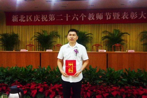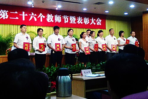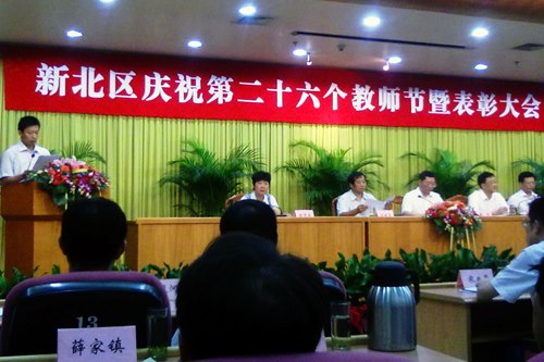 在国歌声中,每位与会代表都为能服务于新北区的教育事业而感到骄傲。高新区管委会主任、新北区区长杨平平宣布了2010年新北区“减负增效”的先进个人名单和对新北区优秀班主任的表彰决定。各位学校的代表老师都带着幸福和自豪走上领奖台,我校的芦启顺老师代表河海中学上台领奖。