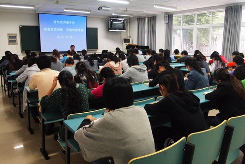 二说我校发展的重大事。经学校申报和新北区教育行政部门统一部署,我校将于2012年创建常州市优质学校。蒋校长介绍了创建的意义、评估的原则、验收的流程,以期通过评估,指导学校总结、发现学校不足、寻求发展策略。