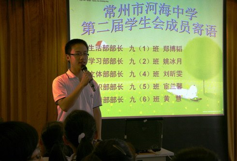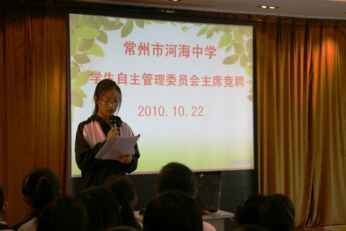 竞聘演讲结束后,竞选工作小组进行了紧张的投票、唱票工作。最终,八(3)班的陈颖同学以优异的表现获得了最高票数,当选为常州市河海中学学生第三届自主管理委员会主席。陈颖主席随后和大家一起分享了成功的喜悦,热情洋溢地表达了自己对今后工作的信心。
