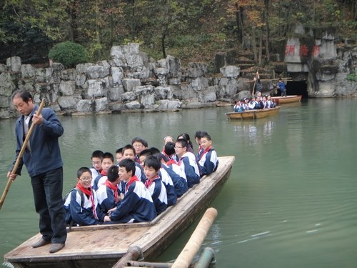 带着制陶的乐趣和实践的喜悦,大家向下一个目的地——慕蠡洞出发。慕蠡洞景观壮丽、气宇非凡。洞口外的嶙峋怪石早已引起大家的惊叹。进入洞里,才发现“别有洞天”。形态各异的钟乳石,浑然天成,述说着岁月无声;持续不断的水滴声,千年不变,阐释着时光流转。同学们兴致勃勃地听着导游的讲解,沉醉于自然的鬼斧神工,畅游于想象的奇妙世界。乘坐木船离开洞口时,大家依然意犹未尽。