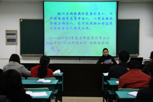 宣讲队员用生动的语言,丰富的素材展现了三位老师高尚的师德师风。“完美追求,学无止境,热心助人,无怨无悔”是