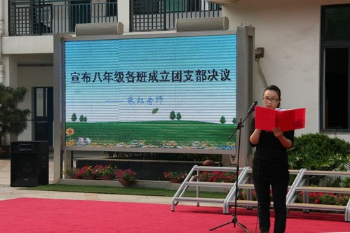 最后的时刻到来了,“允许七年级全体少先队员离队”,在主持人庄重的话语声中,同学们都依依不舍的摘下红领巾,叠好放入自己的口袋。同时,老团员也为新团员别上了闪亮的团徽并由八(1)班孙吉宇同学带领全体新团员宣誓。整个仪式过程中,同学们都庄严肃穆、精神饱满,在这样的氛围中,在这具有纪念意义的场景中,受到了深刻教育和触动。