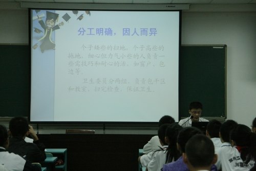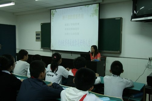 首先,由学生干部代表发言。孙吉宇同学畅谈了她的班长工作经验,提出:工作中要以身作则、积极主动、讲究方法,还提供了几个管理自习课纪律的金点子。值周班长代表陈颖同学详细地介绍值周工作的内容、注意事项,强调在值周工作中要主动处理问题,尽量不让老师操心。对于如何做一名优秀的值日班长,八(2)班的程亚丽同学也和大家进行了交流,她提出:工作中要懂得树立榜样、善于沟通。李希涵同学作为学习部长给了大家这样的建议:以身作则,用心服务,促进班级良好学风建设。对于班级卫生工作颇有经验的七(6)班张成龙同学向我们介绍了他们班级的卫生工作理念,这就是:怀揣责任,着手细节。