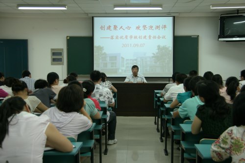 为了迎接优质学校评估,2011年09月07日中午,河海中学在多媒体教室召开了“落实优质学校创建责任”动员会议。围绕“创建聚人心,攻坚迎测评”主题,蒋顺国校长向全体教职工部署了工作,分解了责任:坚定创则必成的信心;强化恪尽职守的意识;牢记依靠师生的理念;坚持重在长远的思路。此次会议使老师们进一步明确了创建工作的重要意义。