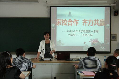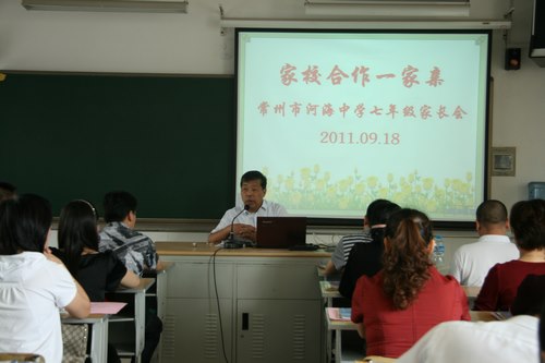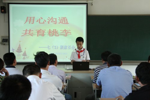 随后,各班结合自身情况开展了交流活动。各班主任根据学校要求与班级实况,以图文并茂的形式,给家长展示了新学期学生的成长表现,向家长介绍了爱生乐业的任课老师,与家长分享了治班理念、发展目标、班级特点,以方便家长更好地配合学校教育,形成家校合力。在交流过程中,学生代表和家长代表也分别谈了自己的想法。如七(3)班学生代表管仲毓这样说到,进入河海中学的短短三周,让他懂得了学校制度的严谨与规范,让他感受到了任课老师的热情与敬业,让他体会到了班级同学的温暖和团结,他快乐而充实着。七(1)班家长代表认为在家庭教育中要做一个智慧型的家长,注重孩子德行的培养,要认同孩子的天性,激励孩子个性的成长。有效的沟通,全面的分析,使家校之间达成了共识:以“关注变化、适应环境、习惯培养”为中心,创设和谐的校园环境,营造良好的家庭氛围,共同促进孩子的全面发展。
