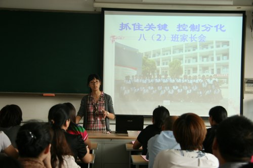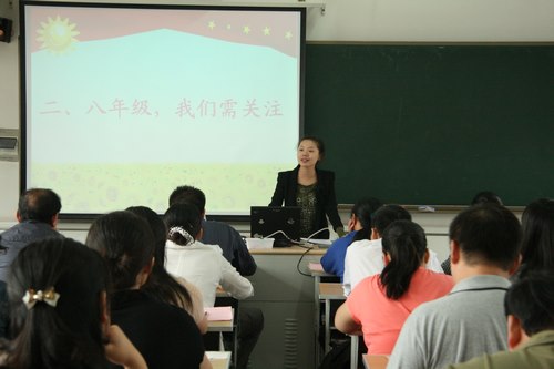 接着,会议以班级为单位,由班主任结合本班具体情况作了进一步交流和介绍。各班班主任精心准备,利用生动的图片、教育的实例向家长们介绍了新学年里班级的新起点新气象、新理念新目标、新努力新进步、新关爱新奉献等,同时带领家长认识了八年级需要共同面临的问题、班级个性特点等等,最后就学科特点和家庭教育对家长提出了建议,希望他们积极配合学校工作。会议的气氛融洽而和谐,家长听得十分专注,从中也获益良多。