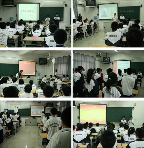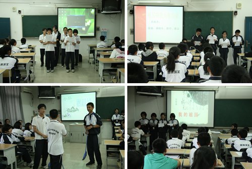 八年级班会活动妙趣横生,极具感染力。同学们学唱《爱我中华》、《团结就是力量》、《龙的传人》等歌曲,绘声绘色,精彩十足。尤其八(1)班的“祖国知识竞赛”环节,在知识与奖品的激励下,同学们踊跃参与,气氛热烈。一张张绚丽多彩的PPT,一首首感人肺腑的诗歌朗诵,一曲曲激情昂扬的歌曲,把本次主题班会活动推向了高潮。