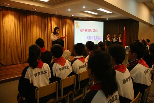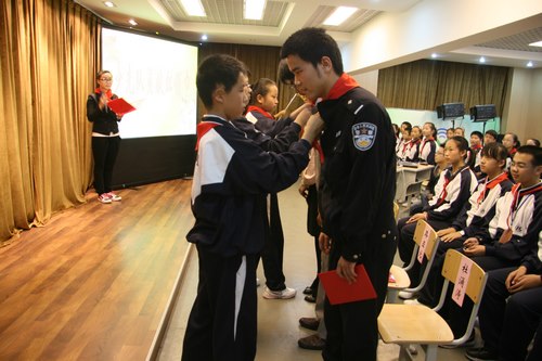 在聘任仪式上,学校党支部书记蒋顺国宣读了聘任决定:聘任杜涌涛教导员为法制副校长,聘任薛凤英主任、路亚北部长为校外辅导员,并向他们颁发了聘书。少先队员代表为他们佩戴上了鲜艳的红领巾。薛凤英主任发表了热情洋溢的讲话,她向全体少先队员提出从小树立远大理想,从小养成优良品德,从小锻炼强健体魄的希望。