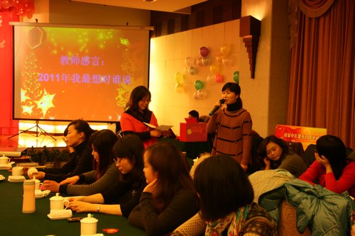 穿插在会议中间的三个感言环节“2011你最大的收获、2011你最想对谁说、2012你的期待”,更是让每个老师有畅谈的平台,老师们自豪畅谈了自己的收获、真诚感谢身边帮助过自己的人,也表达了美好的愿望。他们为学生的进步而喜悦,为个人的成长、学校的发展而自豪,为生活在这个具有凝聚力的团队而幸福着。