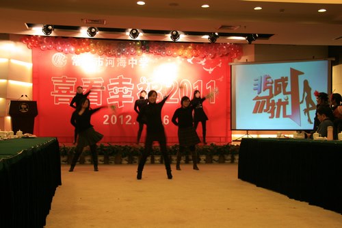 七年级组的《光影征程》,他们利用光影变化,演绎了河海中学创建、创业、创优这一艰难而又令人自豪的过程,令人震撼和感动。40支电筒配上年级组长那充满情感的旁白,演绎一个不可思议的奇迹,它却告诉我们这样一个真理:点点光斑汇聚在一起,就是一股无穷的力量,正是这股力量在支撑着我们,创造河海的一个个奇迹。九年级组的河海版《非诚勿扰》也给我们带来了许多的笑声和快乐,他们用舞蹈、走秀和面对面交流的形式,讲述我们教师的艰辛和快乐。八年级组则用自己的歌声《相亲相爱的一家人》,表达了对同伴的热爱,对大家的祝福。
