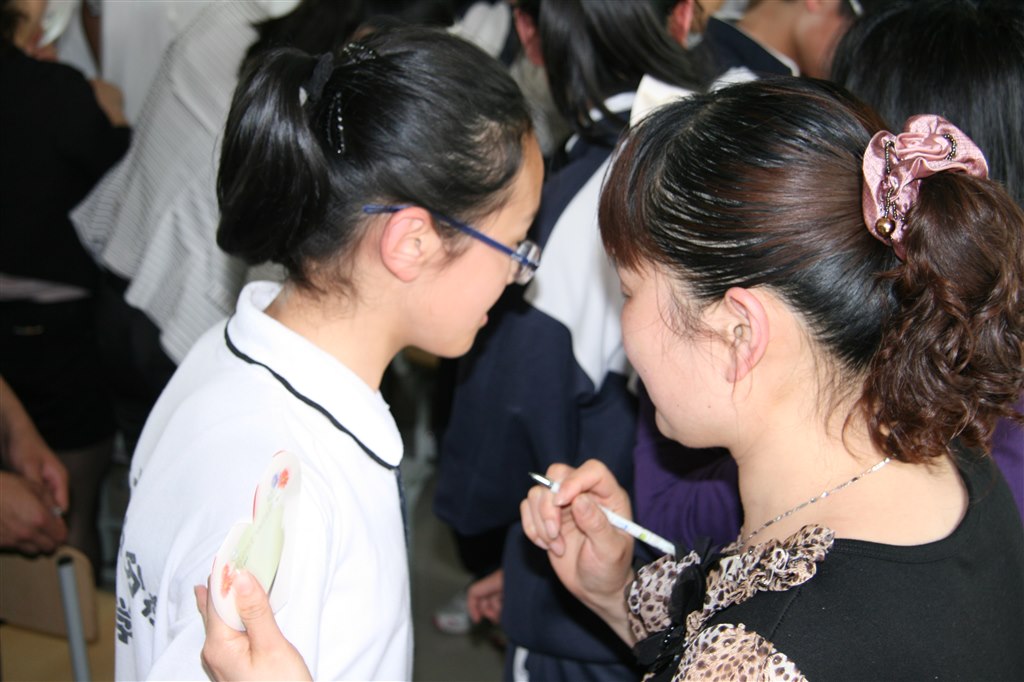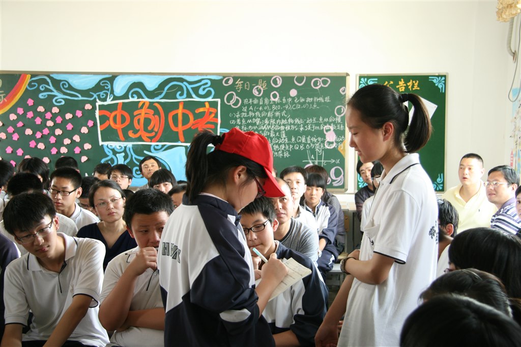 《做好后勤,永不言弃》、《用爱铸就希望》、《训练是为了实战》……家长代表的发言,或鼓舞勇气,或期待成功,或指导方法……但无一不饱含着对孩子的真情真爱。学生代表的发言则热切回应家长的期望,明确冲刺阶段该怎么努力,表明了一往无前的决心。接下来的个人承诺掀起了本次教育开放日活动的高潮,孩子们亲手将一张张精美而又沉甸甸的承诺卡送到家长的手中,庄严许下诺言;家长们按捺不住激动的心情,也为孩子们写下一句句深情的祝福。大手牵起小手,父母与孩子情不自禁地相拥在一起,各班教室里都上演着一幕幕感人的场面。七八年级的小记者们也深深地被打动了,他们抓住这感人的瞬间采访了部分家长和学生。八(2)班小记者吴雪婷这样写道:“这次活动是为了激发学生们的激情,使他们能够坚持不懈地努力下去。可是他们的激情已经迸发且一发不可收拾,又哪里需要激发呢?”