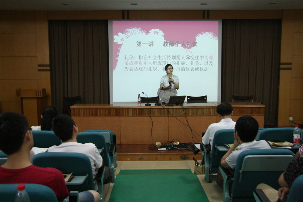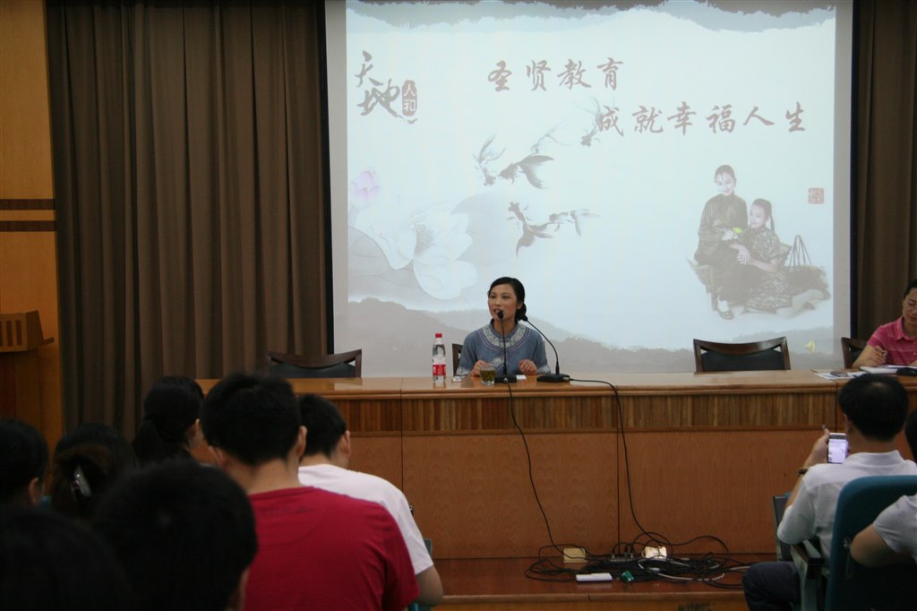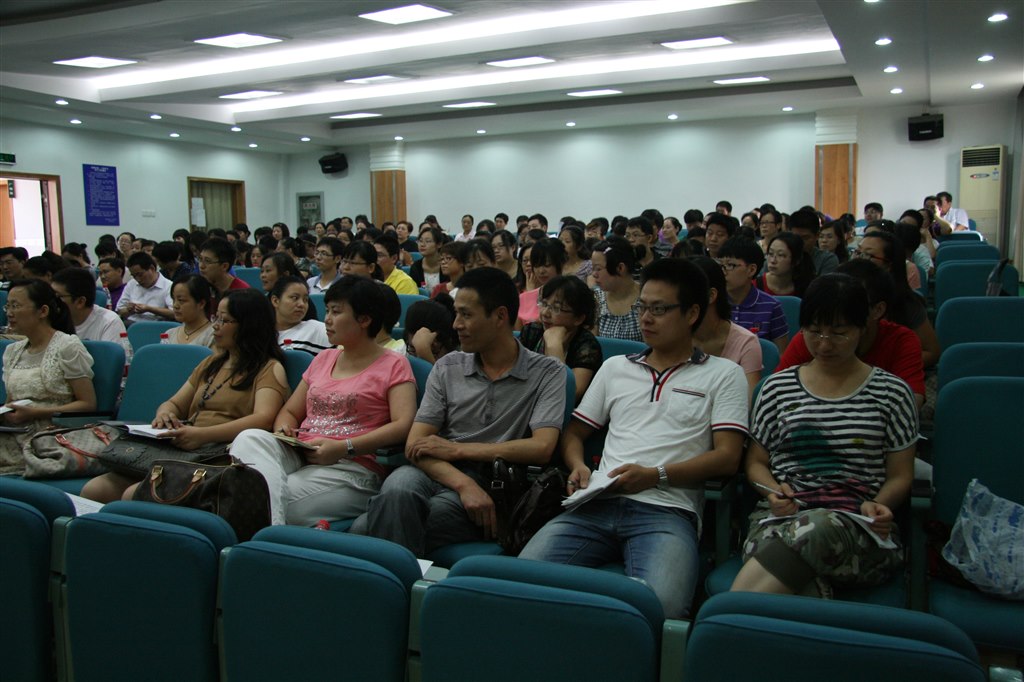 在赵校长简短而鼓舞的开办动员后,国学大师王静凡老师开设了《圣贤之道成就幸福人生》的专题讲座,王老师通过平和的语言、经典的语句,诠释着圣贤教育的魅力和踏实做人的道理。在下午的讲座中,王老师继续介绍了健康的真正含义,并推荐了健康的饮食习惯,让大家体会保健和养生之道,从而拥有由内而外的幸福与健康。江苏技术师范学院的龙一平教授则带来了一场精彩生动的《教师礼仪与修养》报告,龙教授利用丰富的图片资源、贴切的语言表述、适时的现场互动,指导我们要注意个人礼仪、校园礼仪和社交礼仪,要具有教师的精神之美,以此来教育学生,感染学生。