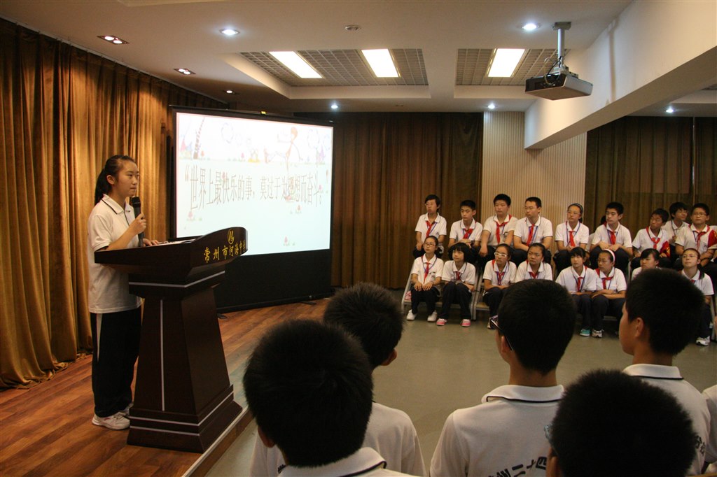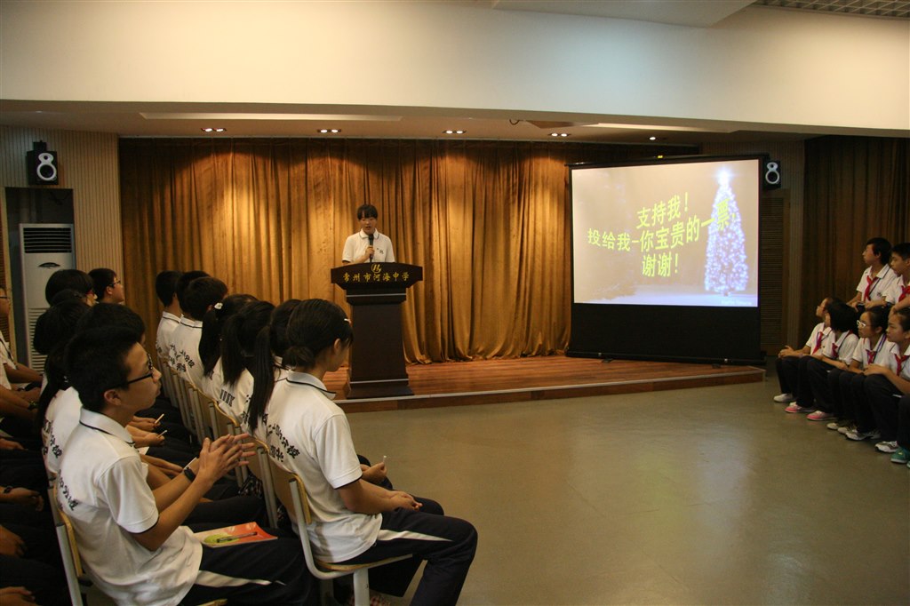 竞聘活动开始前,上一届学生会主席徐艺凝同学做工作总结。她回顾了过去一年学生会六名成员齐心协力组织活动,在活动中历练,在历练中成长的过程。接下来,就是紧张激烈的竞聘演讲。候选人根据抽签顺序依次进行了演讲。他们轮番上阵,阐述工作理念、即兴演讲、拉票演说,每位候选人都做了精心准备。他们信心满满,且妙语连珠,观众时不时报以热烈的掌声和喝彩声。之后,工作小组组织进行了投票、唱票工作。最终,八(6)班的黄艺同学获得了最高票数,当选为常州市河海中学第五届学生会主席。新任主席随即发表了答谢词,表示感谢所有同学的信任,一定会带领新一届学生会竭诚为同学们服务!