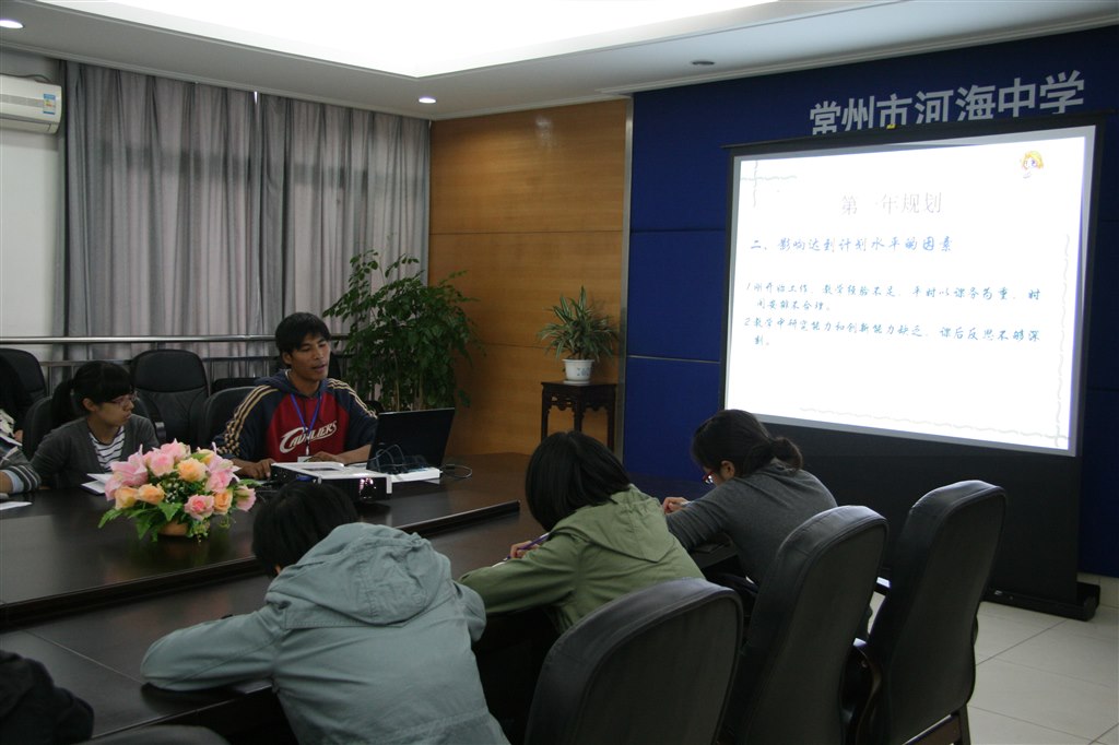 青年教师代表葛娟萍、苗江斌、陈莉分别展示了自己的《个人职业发展规划》,详细介绍了自己每一年发展的具体规划,分析了自己目前存在的优势与不足,并结合自身发展的总体目标,畅谈了影响计划实施的因素和采取的措施。三位教师的发言引起了其他教师的共鸣,他们认识到自己专业成长不快的原因在于缺乏钻研教材的恒心、缺少教育教学的精心、缺欠智慧工作的耐心、缺漏提升自我的决心。