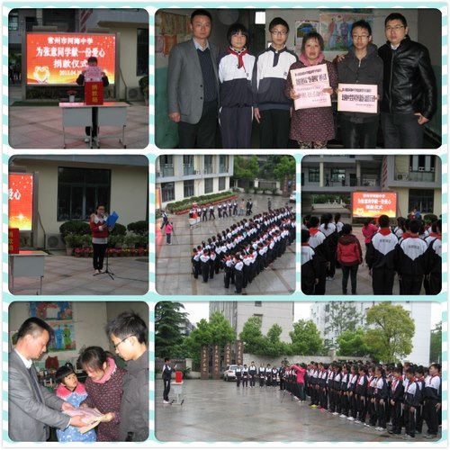 首先,由主持人校团委书记朱虹老师向同学们介绍了张意同学的病情,句句深情的话语打动了在场的每一位师生。接着各班级开始捐款,九年级、八年级、七年级的学生和教师代表陆续走向捐款箱,当一张张饱含关怀的红色捐款单被放入神圣的捐款箱时,在场的同学们整齐肃立,爆发出了阵阵雷鸣般的掌声。此时此刻,天空下起了大雨,这正是师生们凝聚的爱感动了上苍。短短几分钟,大家的心灵都被震撼着,每个人心中的千言万语汇成了一句话:“张意加油,要坚强,我们用无形的力量守护你!”