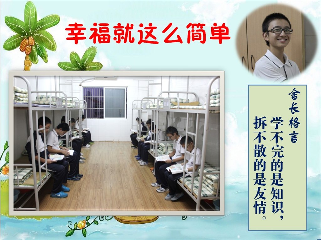 宿舍是家庭的延伸,在这个大家庭里,孩子们可以学会人际交往,生活自理,懂得尊重,善解人意,换位思考,可以学会仁爱、诚实、忍耐、包容。宿舍更是教室学习场所的延伸,在这里,孩子们相互切磋、质疑学习难点,讨论家事、国事、天下事。