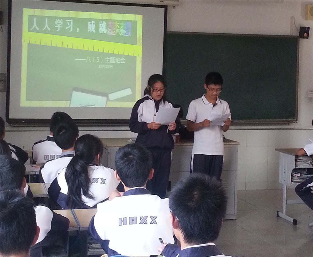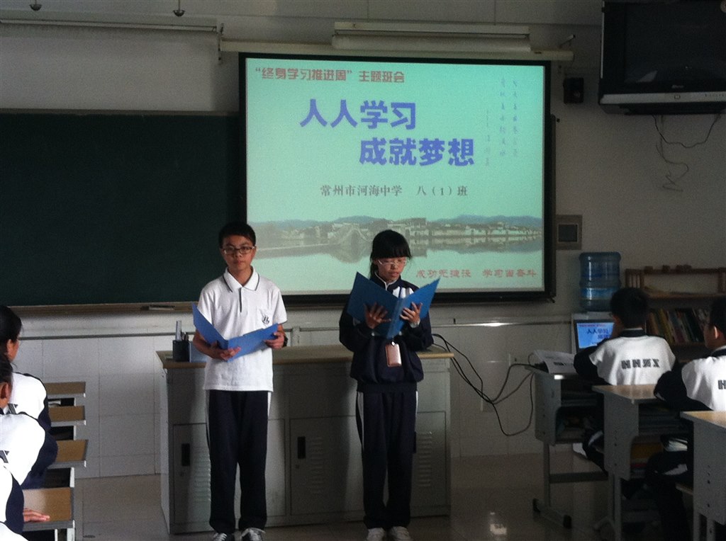 10月23日下午,常州市河海中学八年级各班举行了以“人人学习,成就梦想”为主题的班会,七年级各班也派出了学生代表进行观摩。本次主题班会形式多样、内容丰富、气氛热烈,师生积极参与互动,收到了良好的效果。下面,让我们看看小记者们发来的报道: