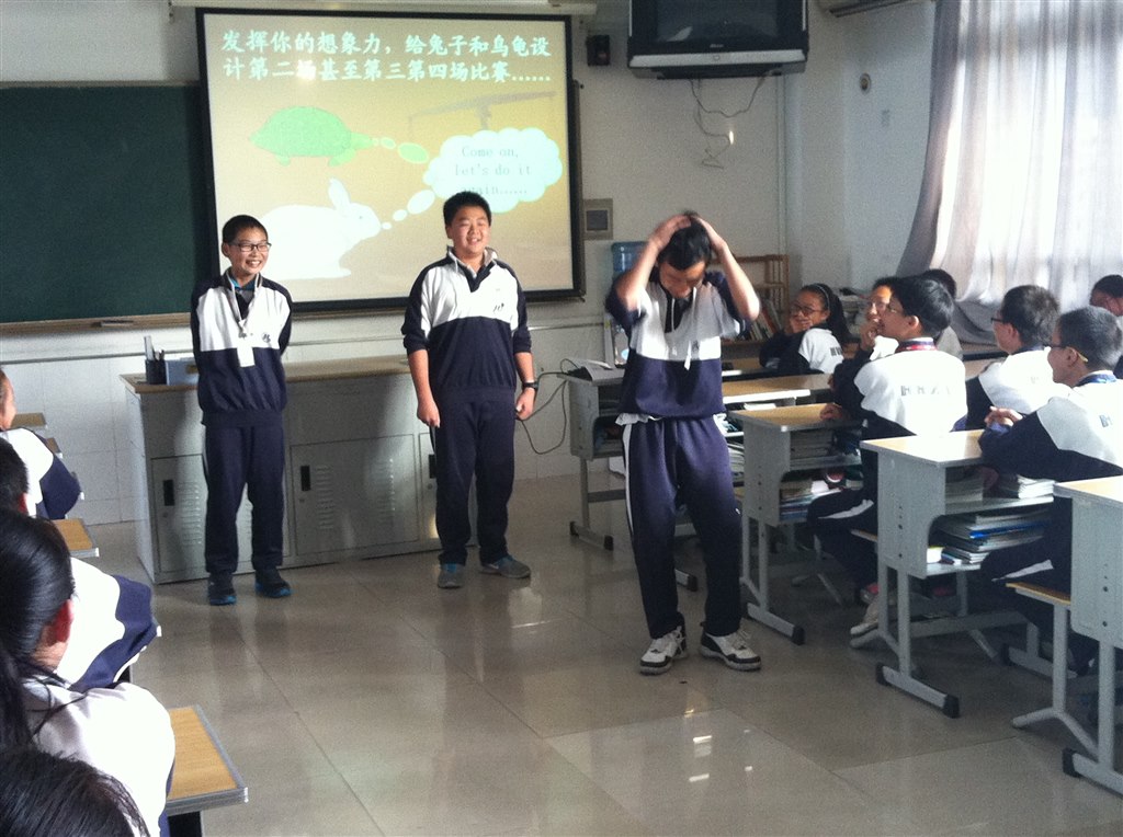 “说到童话,我们有一个熟悉的故事——《龟兔赛跑》。”主持人巧妙地把话题接到了下一个环节。这个故事是我们从小就耳熟能详的,但其中的道理又有多少呢?八(1)班的同学们趁机做了一次“童话家”,把这个故事继续编了下去并从中获得了种种启示。原来,一个小小的童话故事中也能得到很多和学习有关的道理,只要我们肯思考、肯深入、肯发掘。