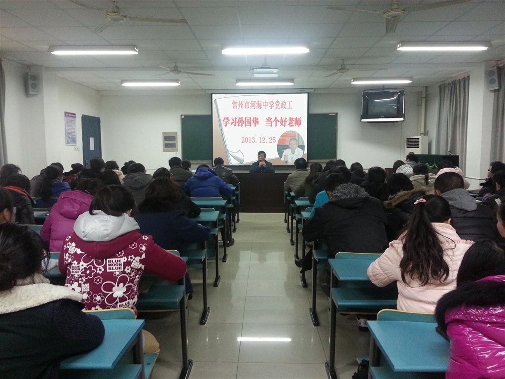 为加强我省师德师风建设,努力办好人民满意的教育,省委教育工委、省教育厅、省教育科技工会决定在全省教育系统深入学习孙国华同志的先进事迹活动。12月25日下午河海中学全体教师齐聚多功能室,在蒋顺国校长的带领下认真学习“中国好教师”孙国华老师的先进事迹。