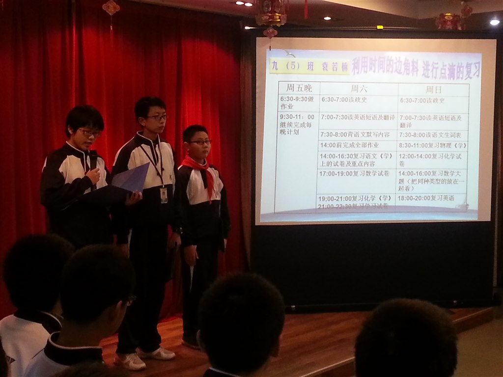 定计划,明确复习方向。首先,七(6)班周逸清同学、八(1)班张汉锜同学和九(5)班袁若楠同学向大家展示了他们的复习计划。清晰的目标、合理的安排、努力的方向让同学们明白了这三位同学不断取得进步的内在原因,尤其是袁若楠同学提出的“利用时间的边角料进行点滴复习”的方法使大家对时间的利用有了新的认识。