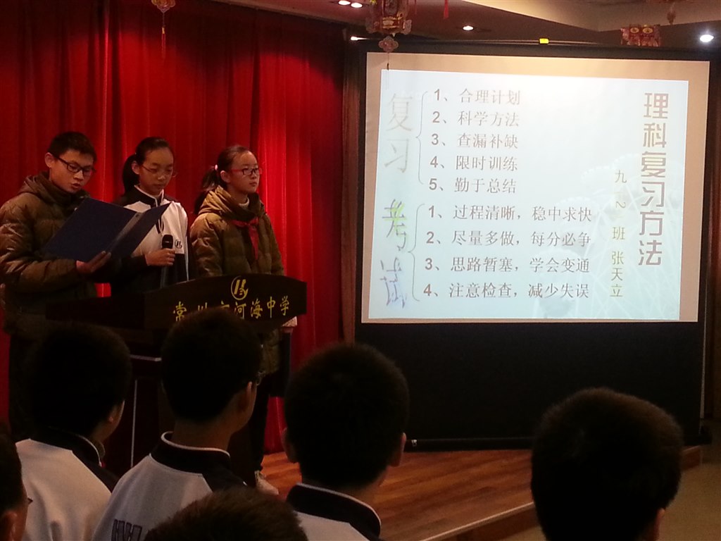 学榜样,提高复习效率。为了提高同学们的复习效率,各年级的十佳代表精心进行了准备,为大家最后阶段的复习支了几招。七(2)班衡珊同学介绍了自己学习政史的心得,八(4)班唐梦洁分享了自己学习英语的小秘诀,九(2)班张天立同学展示了自己学习理科的四大法宝,榜样们毫无保留的支招让同学们对复习迎考又增添了几分底气。