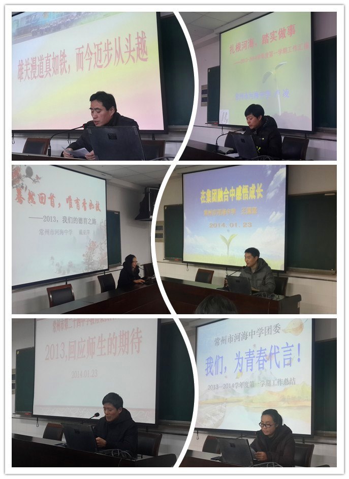 办公室赵军主任以“雄关漫道真如铁,而今迈步从头越”为题谈了自己的工作,熟悉河海校情、感受教师成长、加强学校宣传、服务精细管理、推动集团融合、注重教学质量,面对工作中的困惑与不足,他表示要从“深”、“实”、“韧”上下功夫。教导处卢凌主任真情道出“扎根河海,踏实做事”的心声,思想上不断成熟,提升了对事业的热爱;实践中提高业务,读懂了自己的责任;工作中锻炼能力,树立了服务的意识;工作外不断学习,丰富了自己的阅历;反思自身的不足,促进自己再提高。戴亚萍主任,“蓦然回首,唯有香如故”讲述了具有浓浓文化气息的德育工作,每一项工作芬芳吐艳。全员育人团队和谐给力、德育队伍建设全面推进、主题教育活动亮点纷呈、小记者实践活动持续深入、家长学校教育凝聚合力、心理指导中心闪耀亮相。“在集团融合中感悟成长”,这是本学期从天宁分校到我校工作的王国坚主任的心声,调整心态改变自我、主动融入发展自我、参与管理展现自我、反思不足完善自我是他的心路历程。24中核心校区总务处老主任张大明到我校接手后勤工作可谓是传承与发展的体现。他对自己后勤工作的要求是“用心学、虚心听、认真想、及时做”。团委书记朱虹的“我们,为青春代言!”,展现着青春的活力。志愿者行动闪耀着青春的光辉、升旗仪式传递着青春的旗帜、优秀学生成长忙碌着青春的身影、团队活动合奏着青春的舞曲。