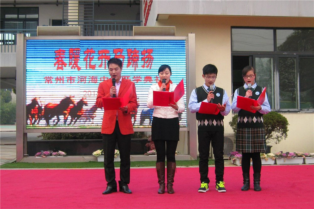 瑞雪开颜,笑迎开学新盛典;东风送暖,喜看马年新气象。02月20日下午,常州市河海中学全体师生精神抖擞汇聚小广场,随着优美的《红梅花儿开》进场曲,主题为“春暖花开马蹄扬”的开学典礼正式拉开了帷幕,开学典礼有师生共同主持,围绕主题分为八个篇章。