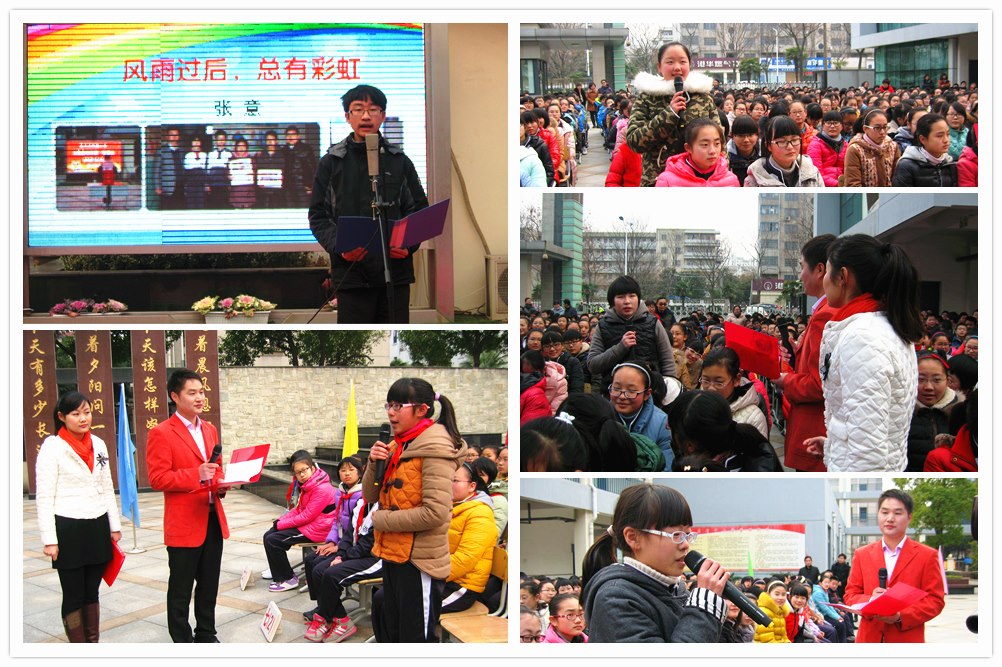 感动花开 他是河海中学一位特殊的学生,命运给了他种种不幸,但他却用自己对生活的热爱、用青春的朝气驱散阴霾。病休在家的八(1)班张意同学来到现场,讲述了他的成长感悟,他感谢全校师生的殷切关爱,感谢社会各界的无私帮助,感谢好心人们帮他一起创造了生命的奇迹,让他感受到了人间的温暖和力量。他讲述了希望再一次走进学校与同学们一起学习的梦想,勉励同学们珍惜老师讲的每一堂课,珍惜学校开展的每一次活动,同时也表达了自己勇敢面对、永不放弃的信心。感人肺腑的话语,感动了在场的每一位师生,触动了同学们向上的愿望。