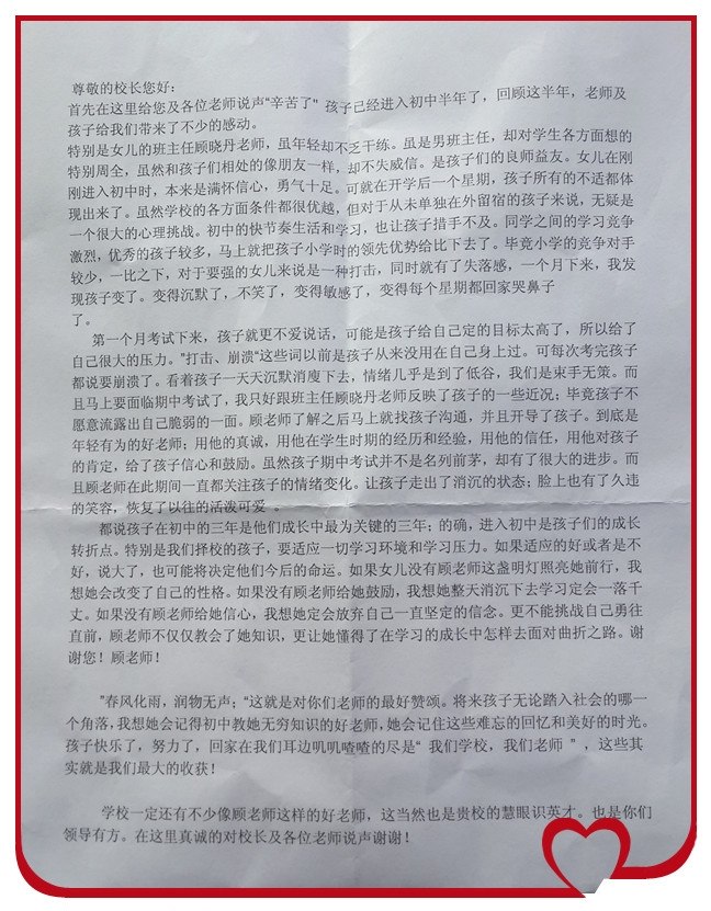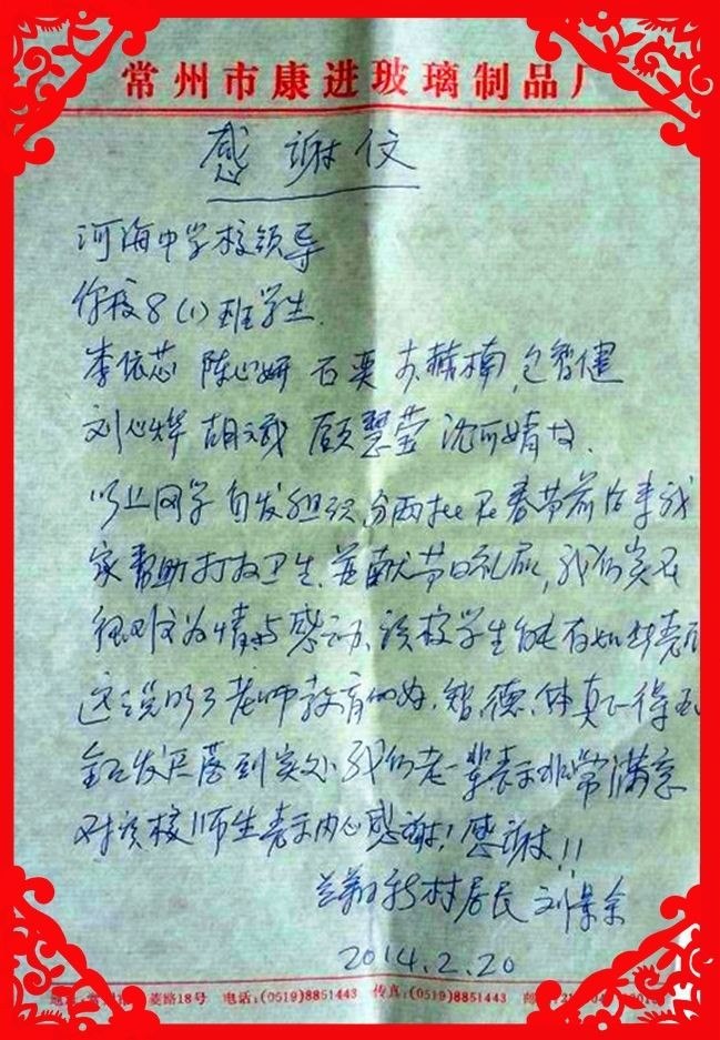 春天来了,在这春暖花开、万象更新之际,我校校长室收到了两份意外的礼物——一封来自兰翔新村居民的感谢信,一封来自七(6)班家长的感谢信。