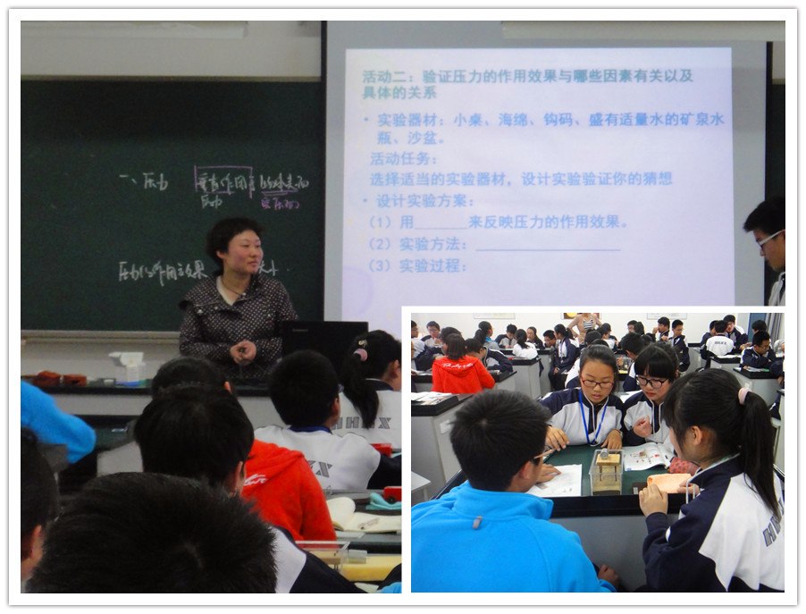 本次活动首先由成员毛叶老师和金洁老师各上了一节展示课《牛顿第一定律》和《压强》。毛老师上课教态亲切自然,富有感染力。她别具匠心的教学设计、多样的教学方法以及充满机智的课堂驾驭艺术,体现了物理创新课堂的教育性、科学性和趣味性的统一。课堂上大量引用了视频、图片等媒介,为学生展示了源自于生活的物理资源,从生活现象中挖掘物理知识,这正体现了从生活走向物理,从物理走向社会的新课程理念。金老师虽然是借班上课,但凭借自己扎实的专业基础、良好的教学素养,与学生的交流显得非常融洽。课堂上学生乐于与她互动,师生十分和谐。尤为突出的是金老师为学生安排的分组实验非常精妙,器材的安排恰到好处。在她的引领下,学生对实验结果展开了激烈的讨论,课堂气氛热烈,给听课老师们留下了深刻的印象。