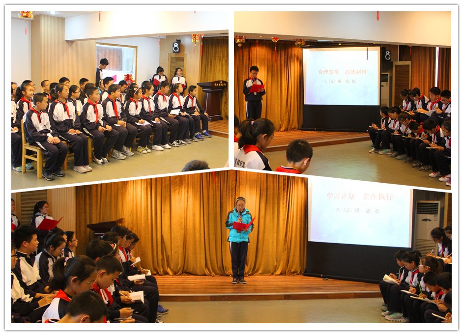 接着,七(2)班张锐同学和八(3)班潘童同学分别就时间利用和计划制定两个方面进行了发言。张锐同学强调在校复习要有效率,珍惜时间要抓点滴,自主复习要讲方法。潘童同学则向大家展示了她的“五一”小长假复习计划,并告诉大家制定计划重在科学、完成计划贵在坚持。身边榜样的“温馨提醒”入情入理,让大家明白了时间和行动的重要。