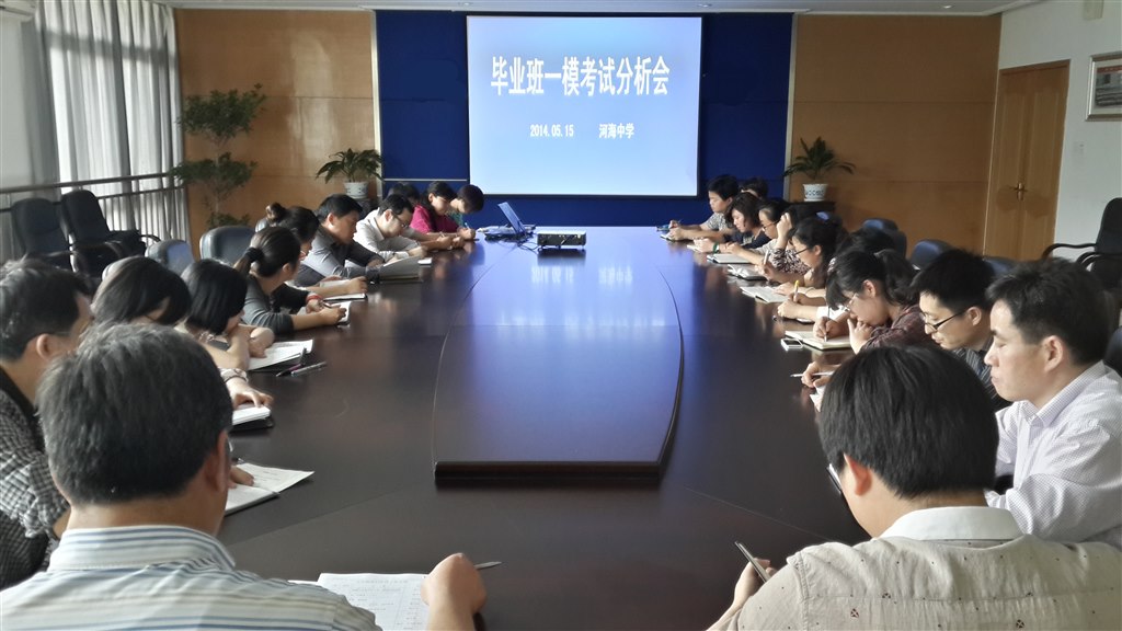 05月15日,河海中学毕业班一模考试分析会在会议二室召开。会议由教导处主任卢凌老师主持,蒋顺国校长和九年级全体老师参加了本次会议。
